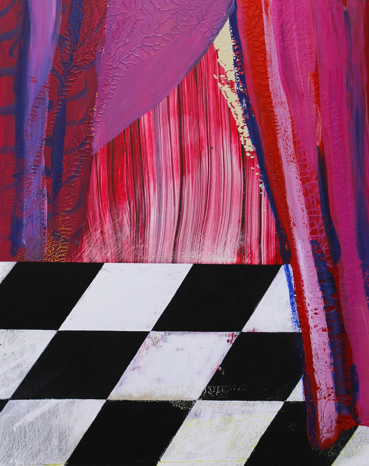 There are the cacti arms of Old Moon, 2016 that see their commonality with and call to the fingerling bendy trunks in Rock Garden, 2016. Checkered black squares alternately form a panel in Portal, 2014, and a planar floor set askew in Parlor, 2014. Berry does not employ a vanishing point in his work. That choice foists the search for perspective back onto the observer-experiencer to decide what is relative to where.