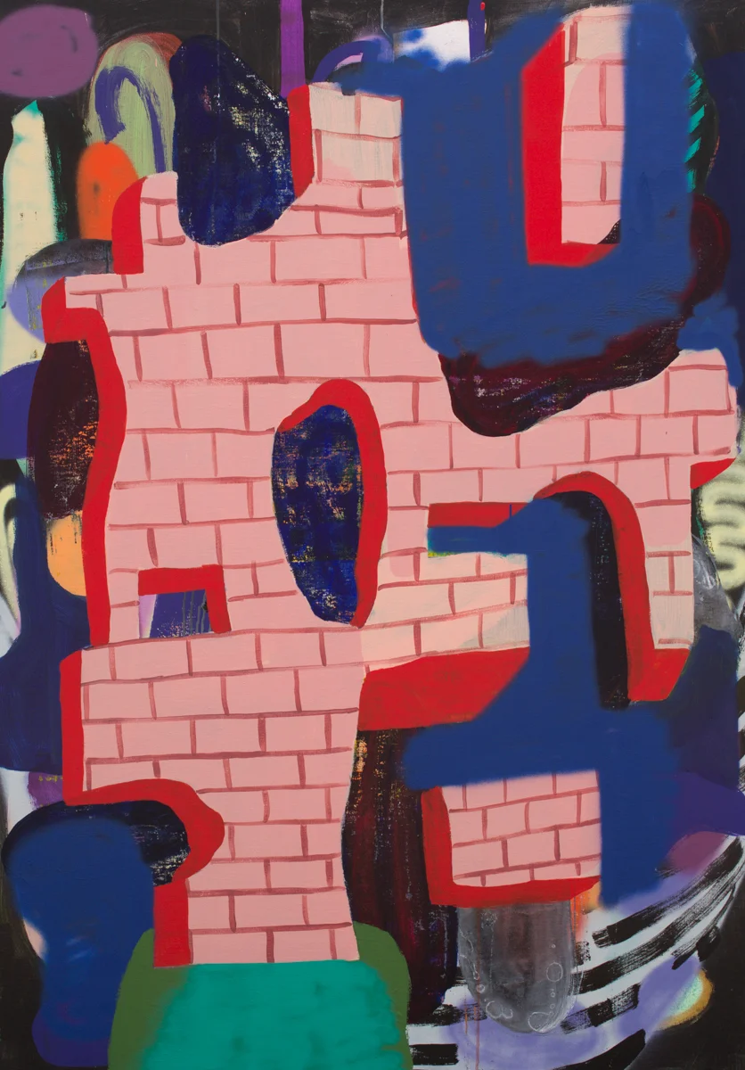In Search Party, 2016, we see a number of Berry's favored forms from the built, natural, and human worlds. An ovoid stone stands before a cut-out brick wall, that rests someplace in relation to pink stripey ground. A blue smurf-like foot sheds a couple tears or sweat beads. What they are hardly matters, though. While the descriptive noun may differ, the language of shapes is distinct and clear.